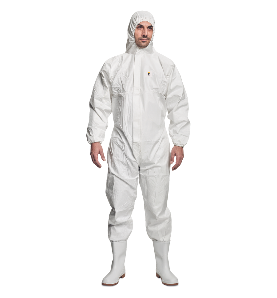 Combinezon de protecţie, antistatic, cu glugă, căptuşeală microporoasă permeabilă la abur, cusaturi etanşate, fermoar frontal cu clapă, manşete elastice la mâneci şi picioare. Produs testat chimic, aparţine categoriei CE III, tip 5şi 6, protejat împotriva elementelor radioactive şi penetrării agenţilor patogeni.